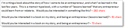 FIrst, the question. You only get 75 characters, which is really pathetic. Here’s what I wanted to write… the third is what I ended up writing because of the space limitation: