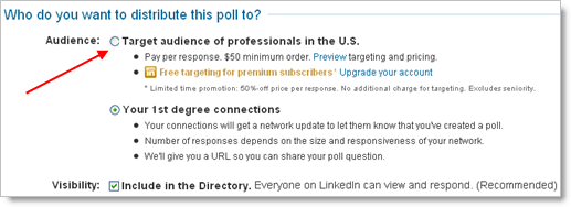 The option defaults to where the arrow is pointing… allowing you to pay for distribution. I forgot I’m a premium subscriber (I think I am, anyway), so I chose the free option, just my 1st degree connections. Also, in visibility, I think it’s a MUST DO to check that box, so others can see it.