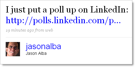 June 8th, 2009 | by Jason Alba |Last week I wrote about using LinkedIn Polls. Super cool opportunity to communicate with your network… today I want to show you what the communication options are. Here is what you see when you create a poll: