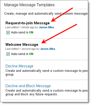 I do know that I want people to get some kind of introduction to the Group, though. So I went to the Manage page and on the left clicked Templates.