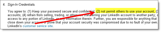 The problem is that LinkedIn thinks that no one should ever log in for someone else. I don’t know where this antiquated thinking comes from, but it’s caused a stir recently. Here’s a snippet from their user agreement (Section 2, #4):