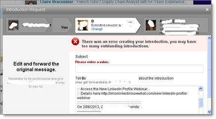 Recently someone asked me to forward an introduction to someone. When I clicked on the link from my email, I went to a page that was hard to understand. I can’t remember if I needed to click on stuff to see the next step or to scroll down or sideways, but when you are forwarding an introduction, the process is CLUNKY.